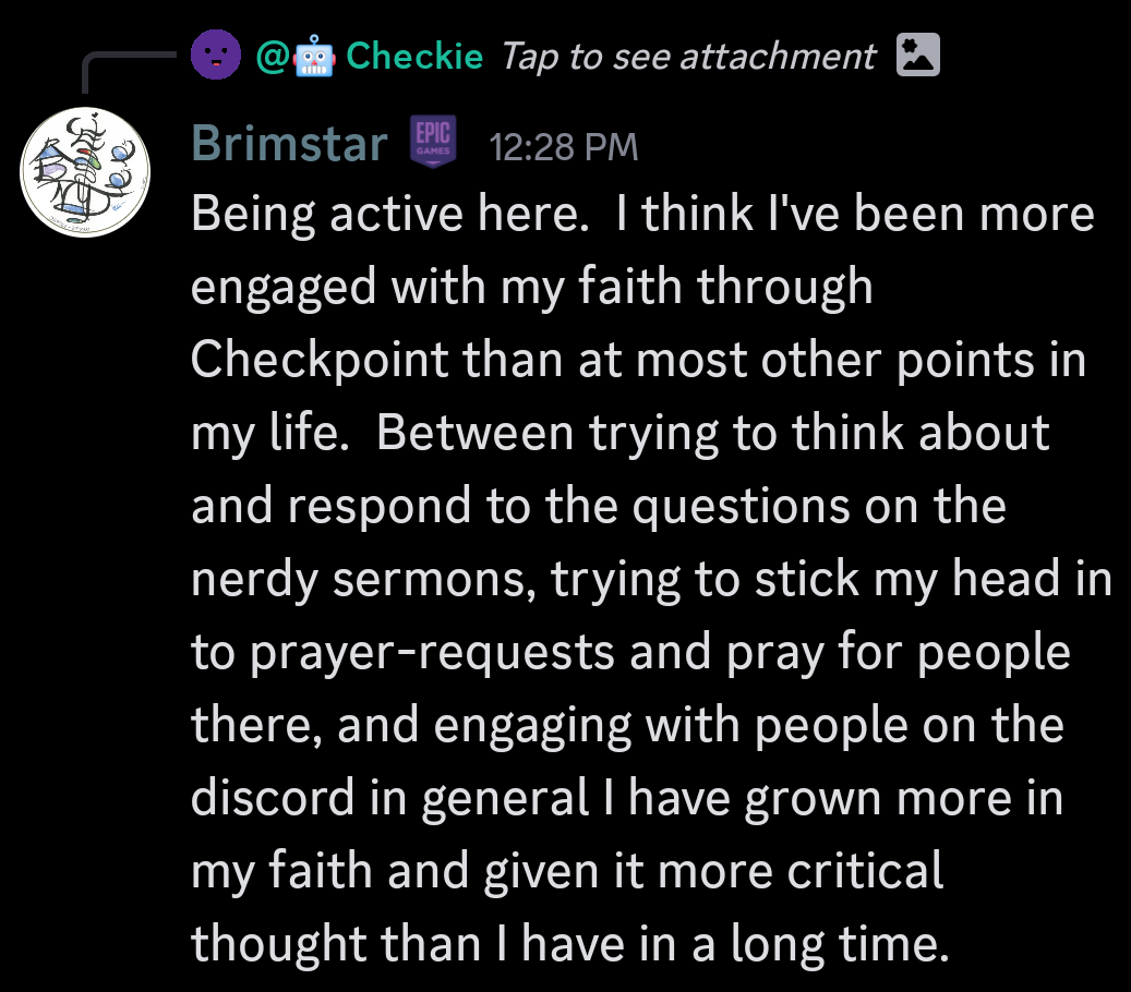 As always, the best place to stay involved and aware of Checkpoint Church on a week-to-week basis is our Discord server or on our YouTube channel. We strive to keep this newsletter for those who are primarily curious about the overarching events at Checkpoint, so many of the smaller, but equally exciting, elements will not make the cut for this space.