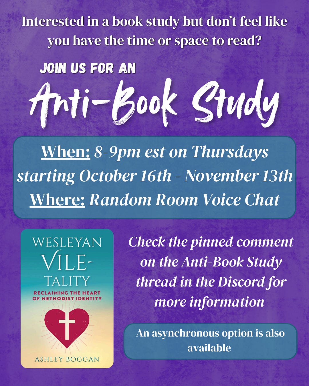 Each Thursday evening, from October 16th through November 13th, for approximately an hour, members of the community will gather and discuss a chapter in the book Wesleyan Vile-Tality: Reclaiming the Heart of Methodist Identity by Ashley Boggan. This book examines the history of John Wesley’s work in reforming the Church of England and the subsequent movement that now encompasses, but is not limited to, the United Methodist Church.